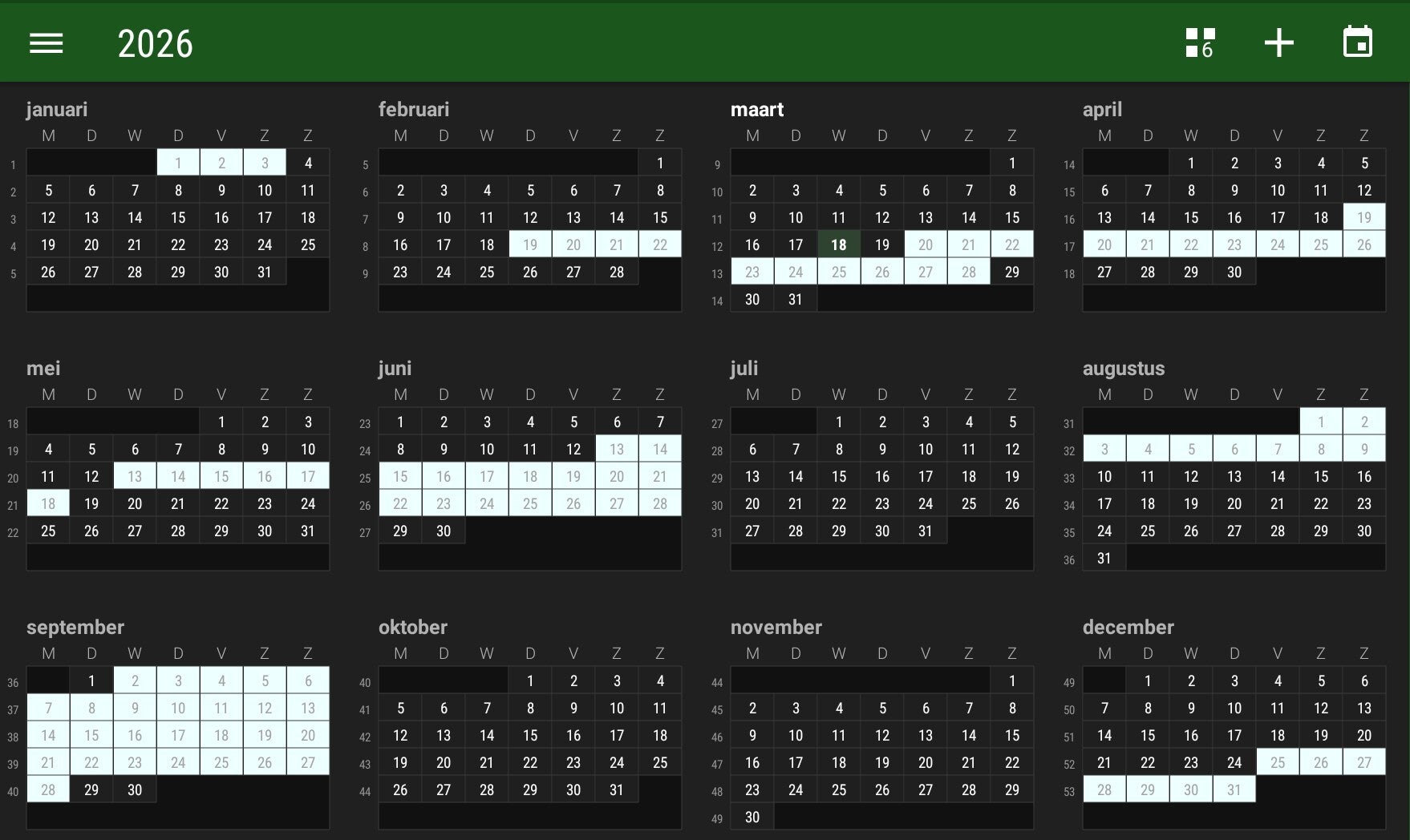 In de agenda van 2025/2026 hieronder ziet u de beschikbare data, de licht gekleurde gebieden zijn al geboekt.
